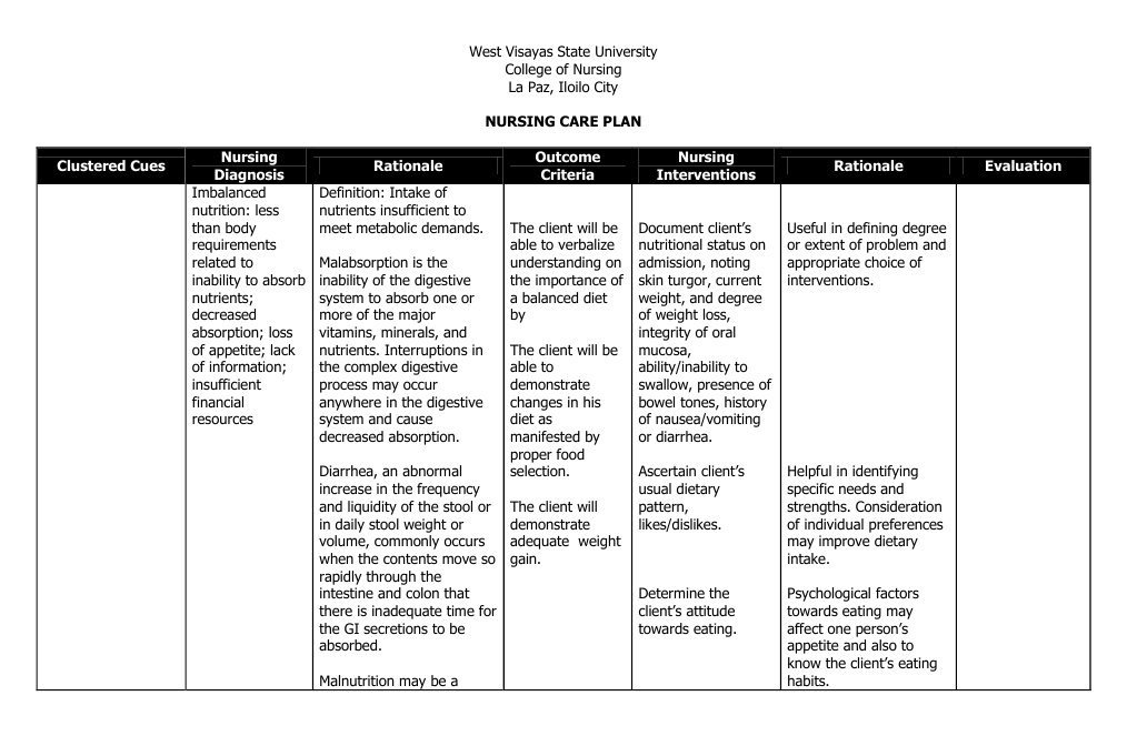 Nursing Care Plan Imbalanced Nutrition Less Than Body Req Pdfcoffee Com