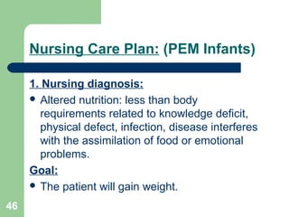 Nursing care plan for a child with Protein Energy Malnutrition PEM Nursing Diagnosis Goals The patient will Nursing Intervention Rational Evaluation Expected outcome Imbalance. Inability in the ingestion and digestion of food or in the assimilation of nutrients due to biological psychological or economic factors such as. Findings According to the classification system of NANDA International the risk for proteinenergy malnutrition is defined with 18 risk factors including associated conditions.