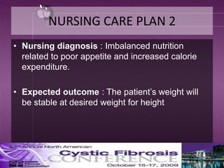 Writing a Nursing Care Plan NCP for Cystic Fibrosis. Cystic fibrosis CF is one of the most common fatal genetic disorders in the United States. The first step in creating an Imbalanced Nutrition Care Plan is.