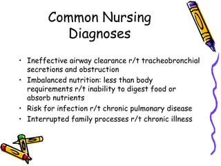 Ineffective Airway Clearance Activity Intolerance. Cystic Fibrosis Nursing Diagnosis Care Plan. A Nursing Care Plan NCP for Nutrition Imbalance starts when at patient admission and documents all activities and changes in the patients condition.